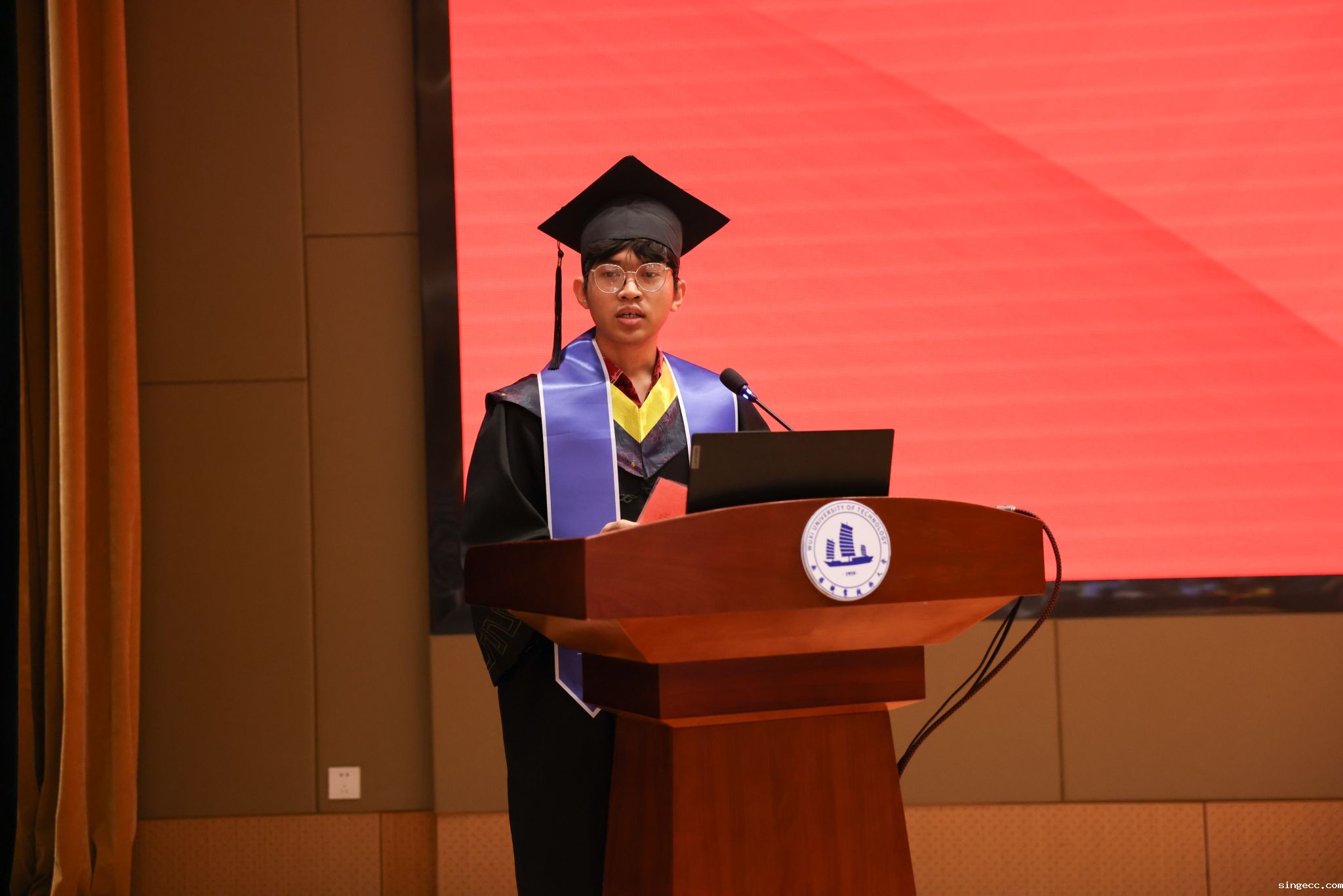 龚方红在致辞中向圆满完成学业的留学生表示热烈祝贺,回顾了同学们在锡求学期间克服文化差异、精进专业技能、积极参与校园文化生活的动人点滴。他指出,在全球教育互联互通的时代浪潮下,留学生是沟通中外文化与技术的宝贵桥梁,希望同学们能继续积极传播中国文化,讲述中国故事,搭建起友谊的桥梁,在各自的领域绽放光彩,为推动构建人类命运共同体贡献自己的智慧和力量。
